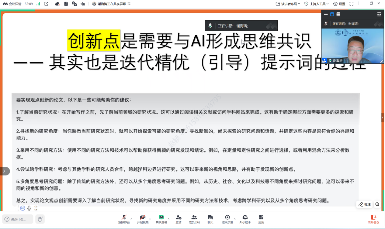 为拓宽教师信息技术认知的广度和深度,增强教师运用信息技术的能力,提升教学科研的效率与质量,6月20日周五晚,教师发展中心举办“AI 在学术论文写作中辅助作用探索”线上专题讲座,北京市科学技术研究院副研究员谢海涛携其科研团队成员担任主讲。本次讲座由教师发展中心委员包韫慧主持,共 80 余名教师在线参与学习。